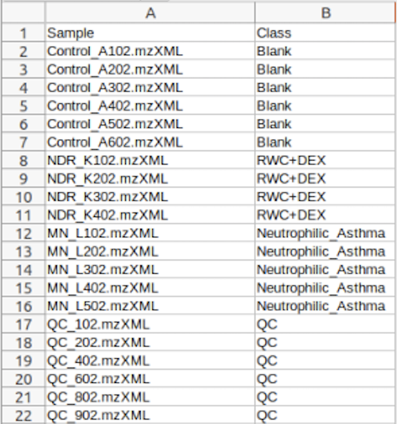 Peak intensity tableThe screenshot below is a LC-MS peak intensity table. Each column represents peaks from a sample. These peaks are grouped and identified by their retention time and mass. The class labels are in the second row immediately following the sample names. ![]() Metadata table containing multiple factors and covariatesThis is a general table containing various descriptors for the data to be analyzed