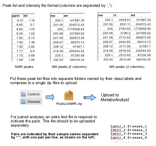 mzTab 2.0-M files (.mzTab)MetaboAnalyst now supports the upload of mzTab files in the Statistical Analysis module. MetaboAnalyst parses both the Metadata Table (MTD) and the Small Molecule Table (SML) to a MetaboAnalyst ready data table format. From the SML, users can either choose to have their features named using the "chemical_name" or "theoretical_neutral_mass". If too many of these are missing however, the features will be named with the "SML_ID". Further, if there are duplicate names, the "SML_ID" will be appended to the end of the selected feature identifier. From the MTD, "study_variable" labeled "Blank" will be excluded from the final data table. Note that MetaboAnalyst supports only mzTab-M 2.0 files that have been validated to ensure that the files can be read by our software. Zipped files (.zip)For NMR/MS peak list files and GC/LC-MS spectra data, users need to upload a zipped folder containing data files from different groups under study (one file per spectrum and one sub-folder for each group ). For paired comparison, users need to upload a separate text file specifying the paired information. GC/LC-MS spectra must be in either NetCDF, mzXML, or mzDATA format. The spectra should be stored in two separate folders according to their class labels then compressed into zip files. Please note, the program is not compatible with the most recent WinZip (v12.0) with default option. Make sure to select the Legacy compression (Zip 2.0 compatible) for compressing files. No space is allowed in either the folder names or the spectra names. The size limit for each uploaded zip file is 50M. Please contact the author if you wish to upload a bigger data size. The peak list data is composed of peak list files organized into separate folders named by their class labels. For example, if your data contains three groups, the peak list files should be organized into three folders accordingly. Compress these folders into a single zip file then upload them to MetaboAnalyst. NMR peak list files should contain two comma separated columns with the 1st column for peak positions (ppm) and the 2nd column for peak intensities; MS peak list files can be in either two-column (mass and intensities) or three-column format (mass, retention time and intensities), but not a mixture of both. The first line of each peak list file is reserved for column labels. The file must be saved in comma separated values (.csv) format. Samples in rows (unpaired)Each row represents data from a sample. The class label is in the second column. For unpaired comparisons, the class label can either be numeric (i.e. 0/1) or character (i.e. Healthy/Disease).