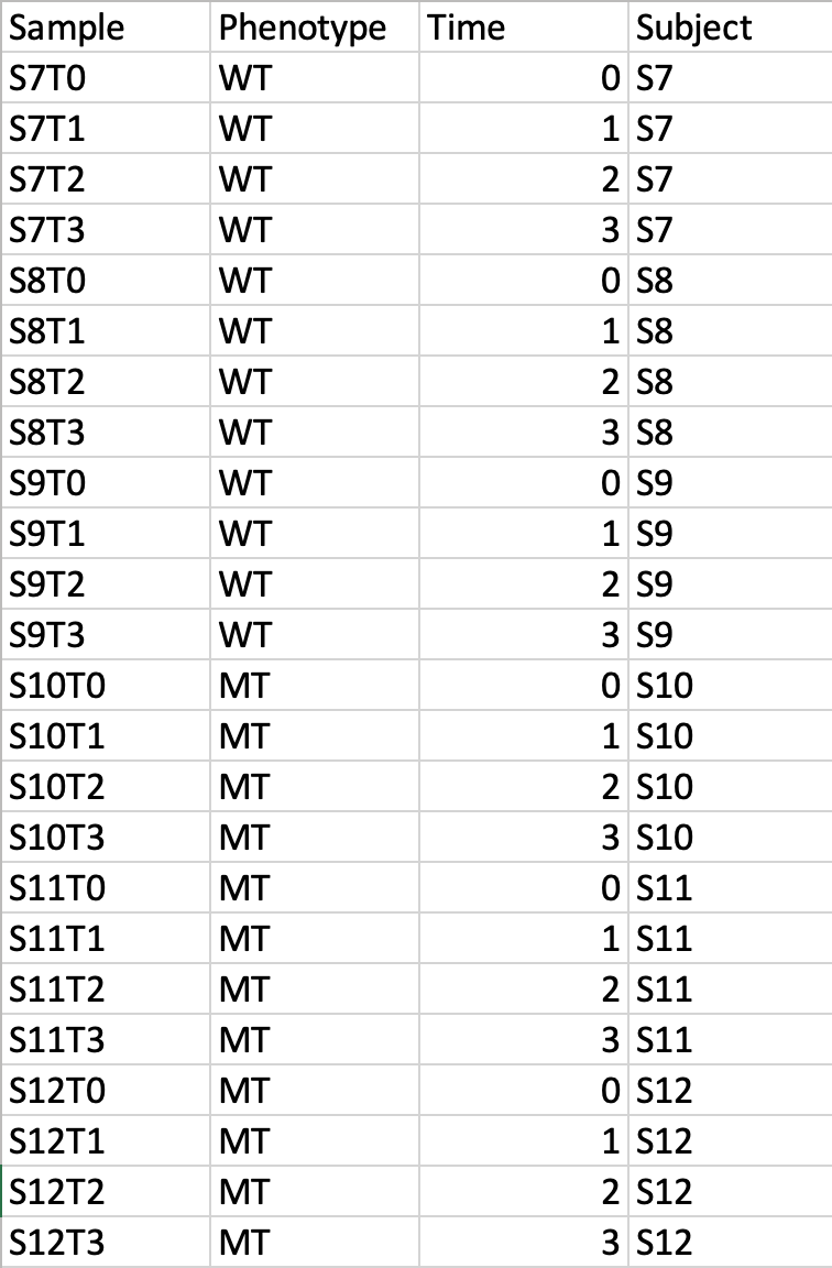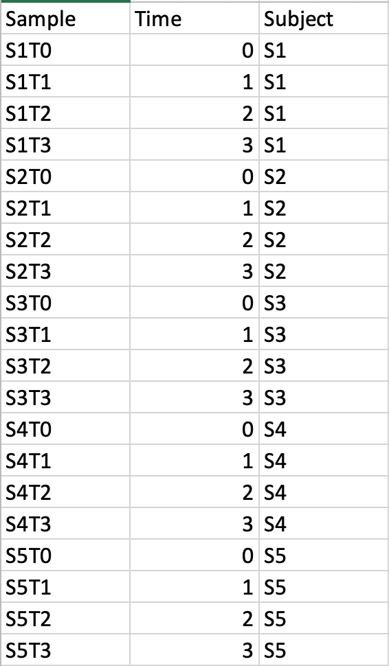 Time-series data onlyThis design requires two factors: the time points column must be labeled as Time; the other label is Subject containing subject IDs across different time points. Samples should be balanced (i.e. no missing time points for any subject). A screenshot of an example data with samples in rows is shown below.